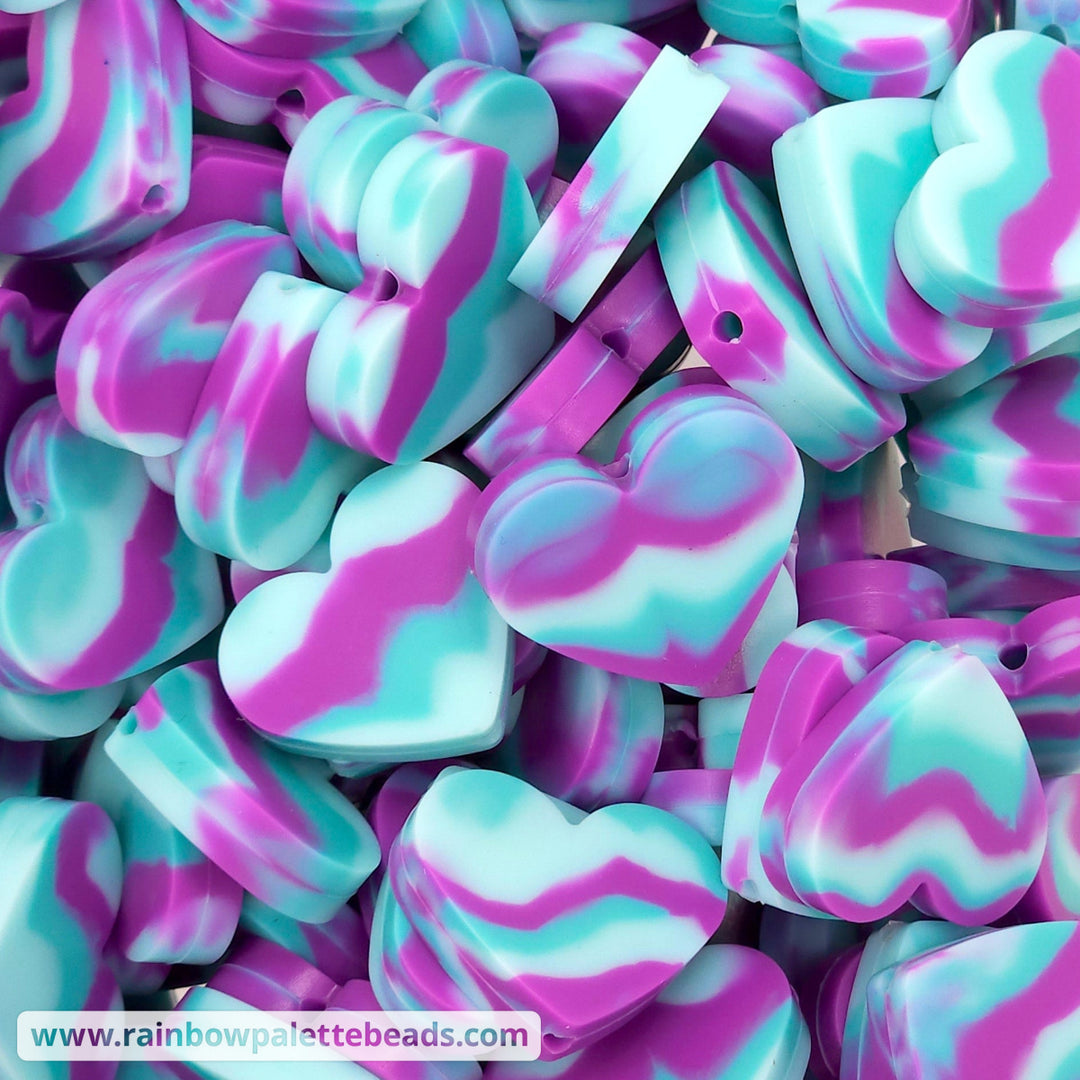 25mm Purple/Turquoise Marble Silicone Heart Focal Beads